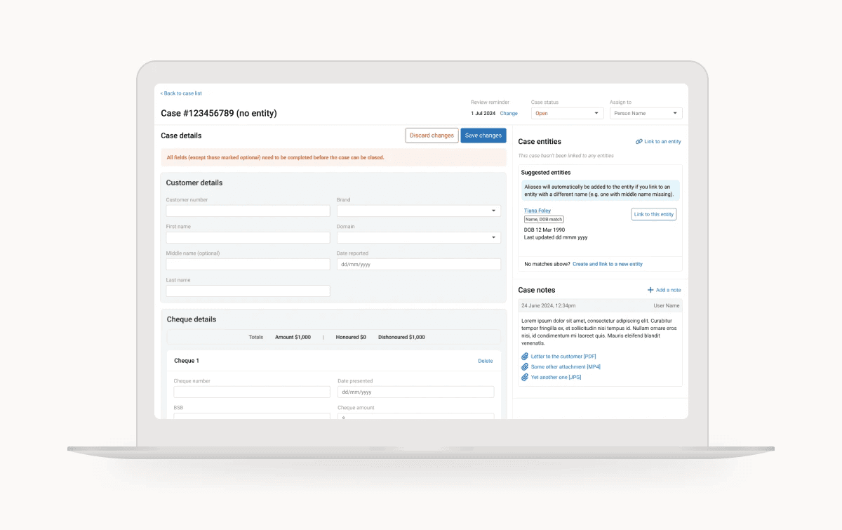 Example 2 — In the existing system, there was no way to specify the type of relationship an entity had to a case, e.g. in scam cases, there is a perpetrator and one or more victims linked to it. This makes it difficult to assess the entity at a glance, e.g. whether someone has many cases linked to them because they are a repeat offender or a particularly susceptible victim. We introduced a property to the link between the case and each entity to make this clear.