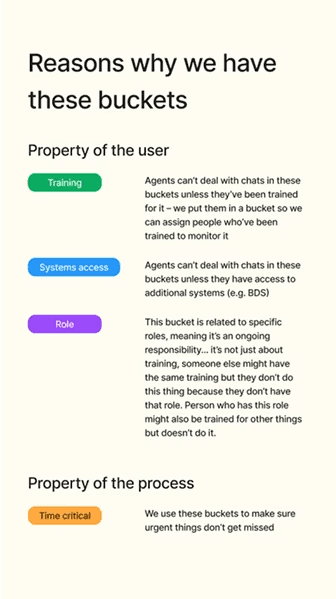 Over time, the single queue had been split into multiple “buckets” (mini queues) for specific chat types that needed to be highlighted for some reason, chats would be triaged into those buckets, and staff would be assigned to monitor each of those buckets.